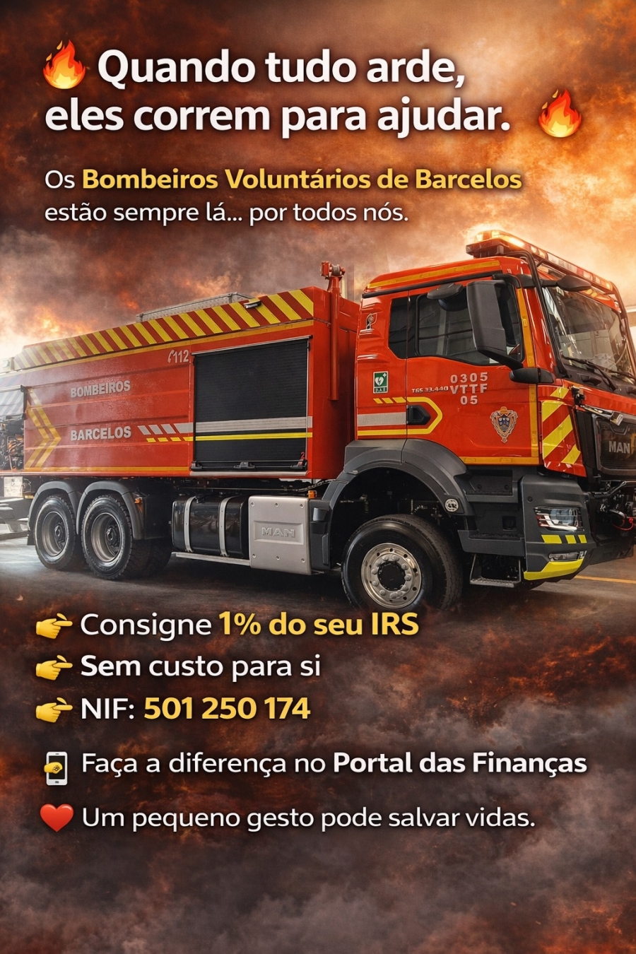 Assim, quando os contribuintes preencherem em 2026, a sua declaração de IRS relativa aos rendimentos auferidos em 2025, podem preencher no rosto do Modelo 3, Quadro 11, Campo 1101 (Instituições particulares de solidariedade social ou pessoas coletivas de utilidade pública), assinalando com um «X» no respetivo quadrado e mencionando o número de identificação fiscal (501 250 174), e assinalando novamente com um «X» no quadrado por baixo de IRS e assim contribuir com 1% do imposto liquidado, para apoiar os Bombeiros Voluntários de Barcelos.